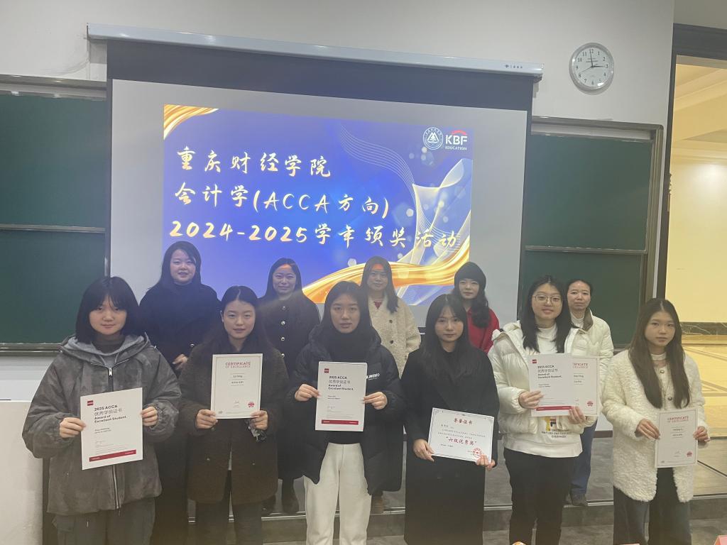 為表彰先進(jìn)、激勵A(yù)CCA學(xué)子,凝聚國際化財會人才培養(yǎng)的奮進(jìn)力量,12月29日下午14:30,重慶財經(jīng)學(xué)院2024 - 2025學(xué)年ACCA頒獎活動于教學(xué)樓1126階梯教室隆重舉行。會計學(xué)院副院長兼ACCA項目負(fù)責(zé)人鮑曉敏、會計學(xué)院教師李茉菡、各年級ACCA輔導(dǎo)員以及楷柏教育高校事業(yè)部重慶地區(qū)主管李春鳳出席了此次活動,全體ACCA方向班學(xué)生共同見證了這一榮耀時刻。