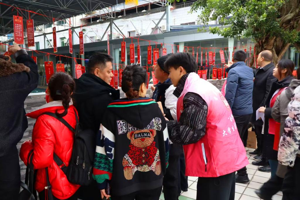 隨著社區(qū)居民陸續(xù)到場(chǎng),活動(dòng)現(xiàn)場(chǎng)迅速升溫,熱鬧非凡。志愿者們即刻各就各位,以飽滿的精神狀態(tài)、親切熱情的態(tài)度投入服務(wù)工作。寫對(duì)聯(lián)、猜字謎、包湯圓等一個(gè)個(gè)特色體驗(yàn)項(xiàng)目輪番上演,志愿者們耐心講解民俗知識(shí)、細(xì)致指導(dǎo)操作技巧,居民們踴躍參與、樂(lè)在其中。志愿者的貼心服務(wù)與居民的熱情參與相互交織、雙向奔赴,讓這場(chǎng)民俗文化節(jié)成為連接校園與社區(qū)的溫情紐帶,更讓沉睡的傳統(tǒng)民俗在沉浸式互動(dòng)體驗(yàn)中真正“活”了起來(lái),煥發(fā)出新時(shí)代的生機(jī)與活力。